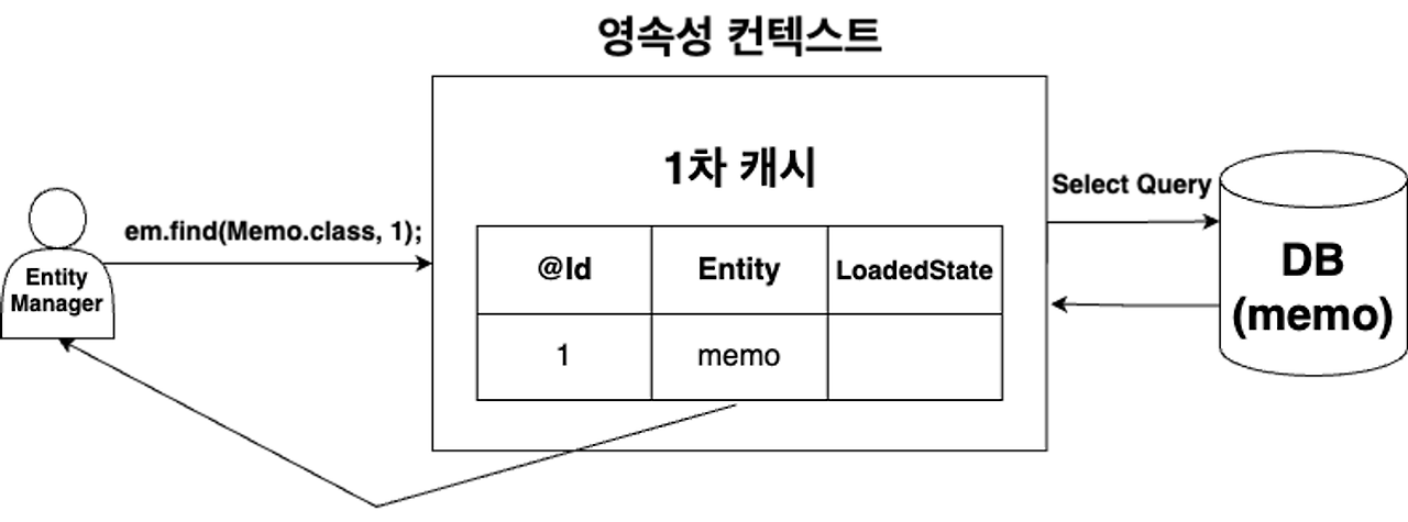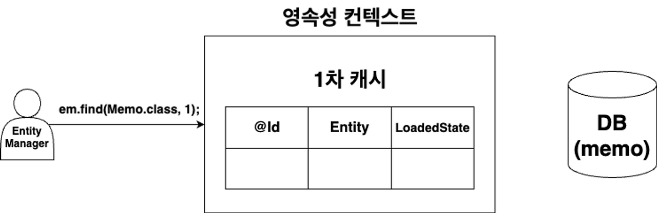 - em.find(Memo.class, 1); 호출 시 캐시 저장소에 식별자 값이 1이면서 Memo Entity 타입인 값이 있는지 조회