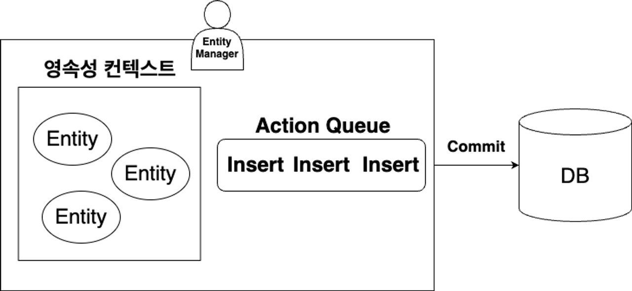 - DB에서 하나의 트랜잭션에 여러 개의 SQL을 포함하고 있다가 마지막에 영구적으로 변경을 반영하는 것 처럼 JPA에서도 영속성 컨텍스트로 관리하고 있는 변경이 발생한 객체들의 정보를 쓰기 지연 저장소에 전부 가지고 있다가 마지막에 SQL을 한번에 DB에 요청해 변경을 반영함