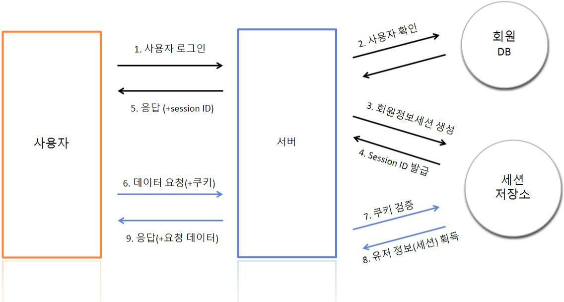 - 클라이언트는 그 session-id를 쿠키라는 저장소에 보관하고 앞으로의 요청마다 세션아이디를 같이 보냅니다. (주로 HTTP header에 담아서 보냅니다!)